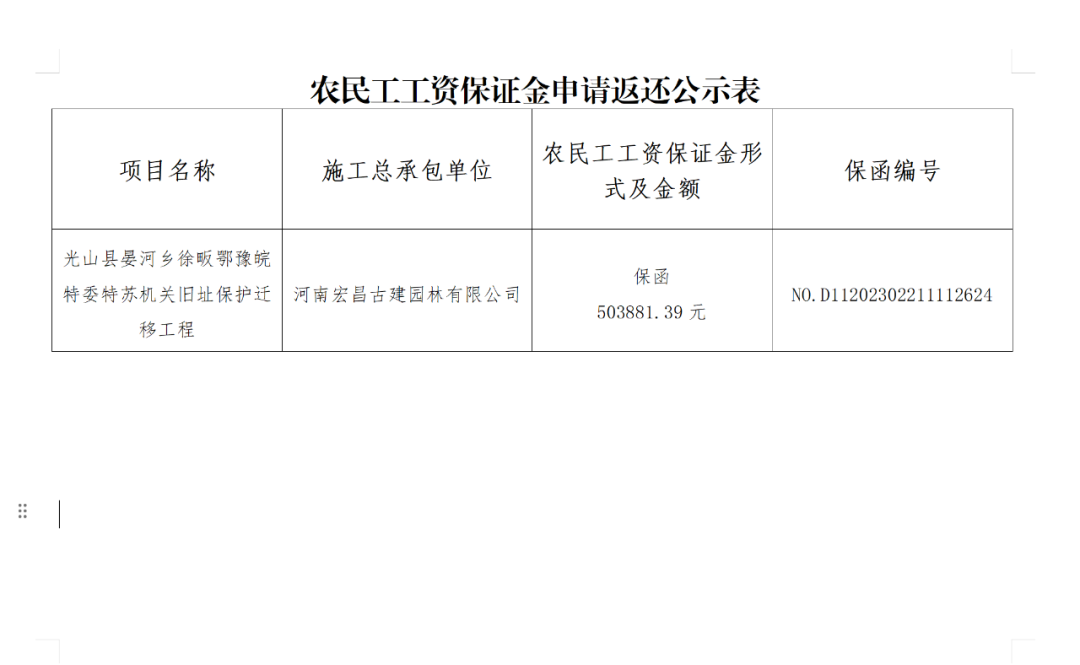 根據《河南省工程建設領域農民工工資保證金實施辦法》(豫人社規〔2022〕4號)第二十九條相關規定,現“光山縣晏河鄉徐畈鄂豫皖特委特蘇機關舊址保護遷移工程”,因工程完工,施工總承包單位河南宏昌古建園林有限公司,向光山人社局申請返還該項目農民工工資保證金保函正本,并承諾該項目施工期間所有勞動者的工資已足額支付完畢。現予以公示。