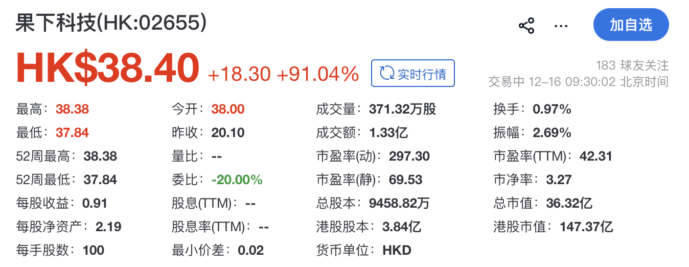 瑞財經 吳文婷 12月16日,果下科技(02655.HK)在港交所掛牌上市,獨家保薦人為光大證券國際。其開盤報38.4港元,漲91.04%,總市值約36.32億港元。