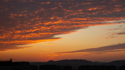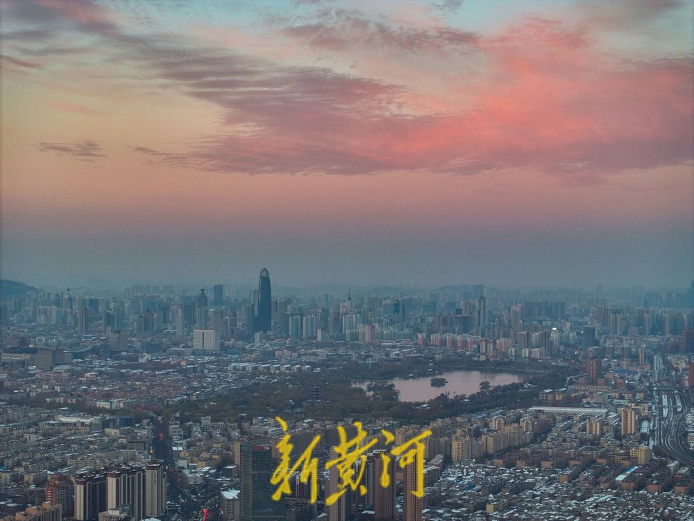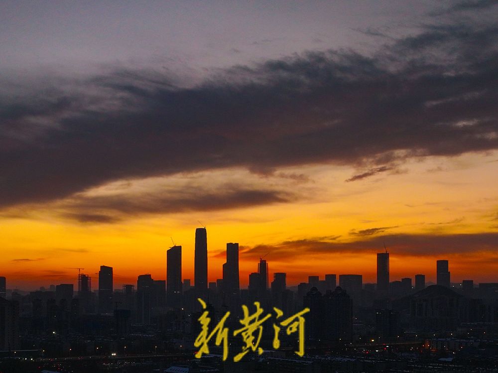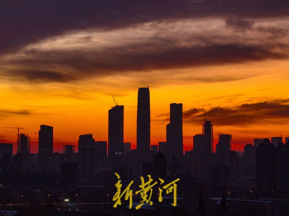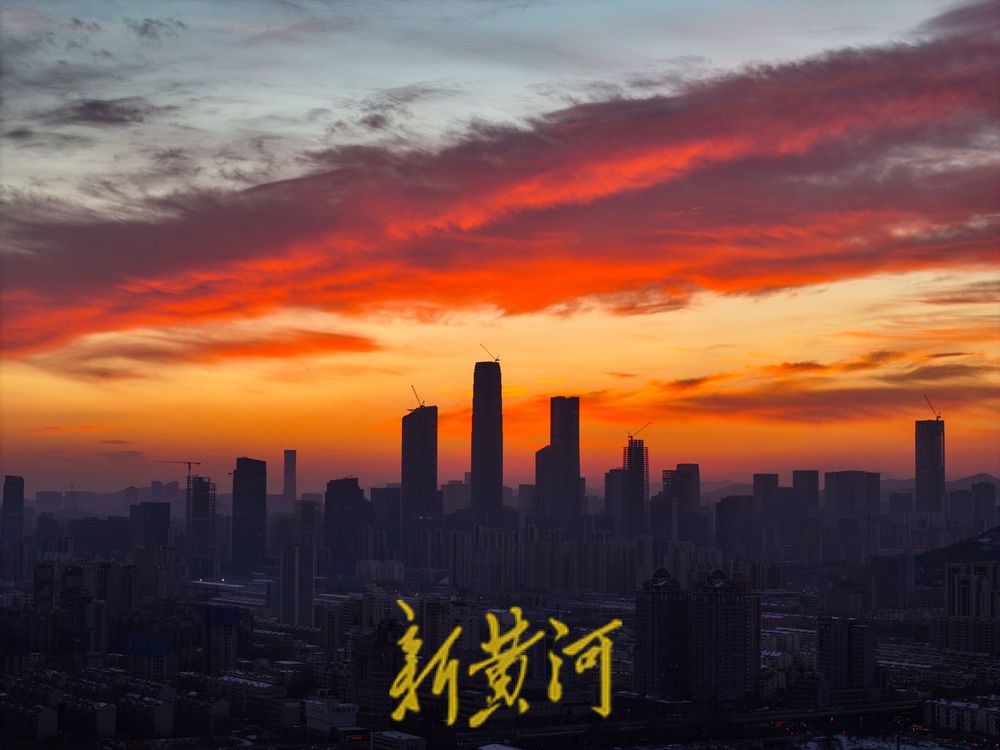 這片磅礴的霞光與中央商務區現代樓群交相輝映,整座城市沐浴在溫暖紅彤的光暈之中。