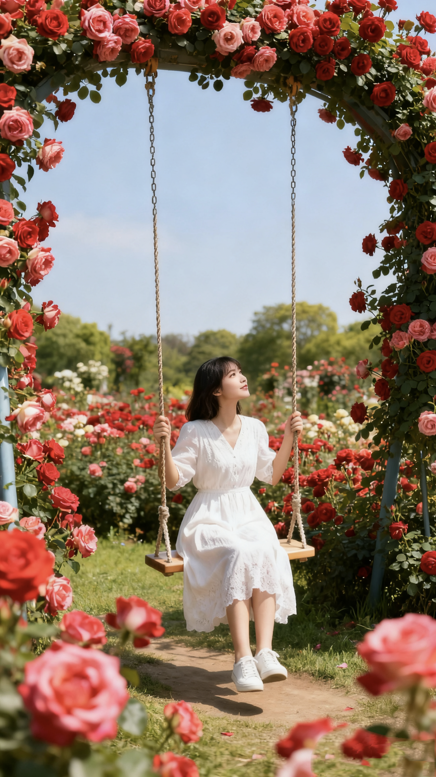 輕輕晃動手腕,秋千便慢悠悠蕩了起來。視線隨著秋千的起伏掠過花拱:上方是澄澈得沒有一絲云的藍天,兩側是密不透風的玫瑰墻,花枝伸展出的細刺勾著裙擺,卻舍不得用力扯。偶爾有蜜蜂從花芯里振翅飛出,嗡鳴著掠過臉頰,又一頭扎進另一朵盛放的玫瑰里,仿佛也醉在了這春光里。