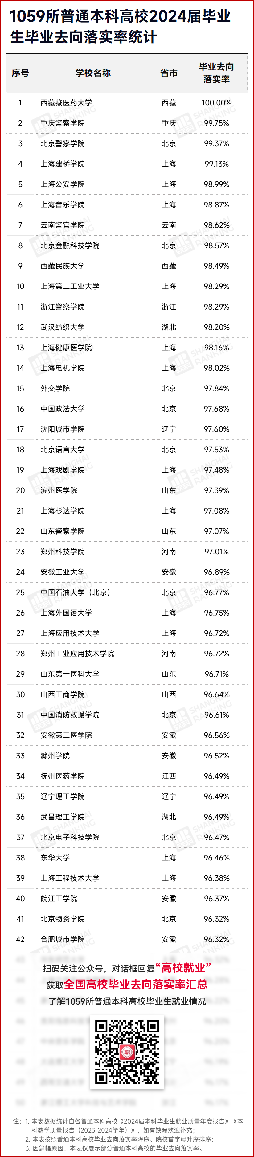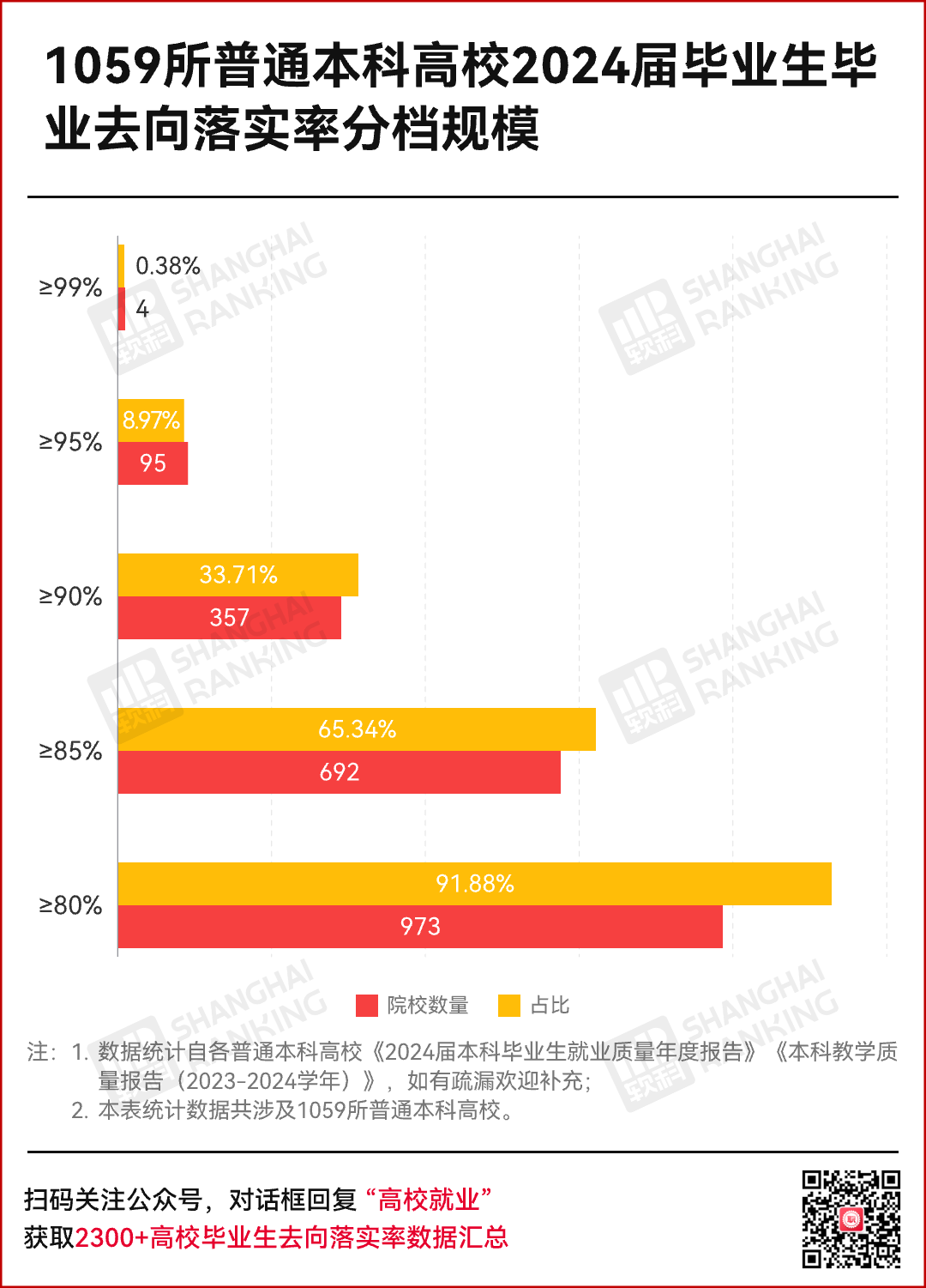 1059所普通本科高校中,近七成院校的24屆畢業生去向落實率≥85%,超三成院校數據突破95%。
