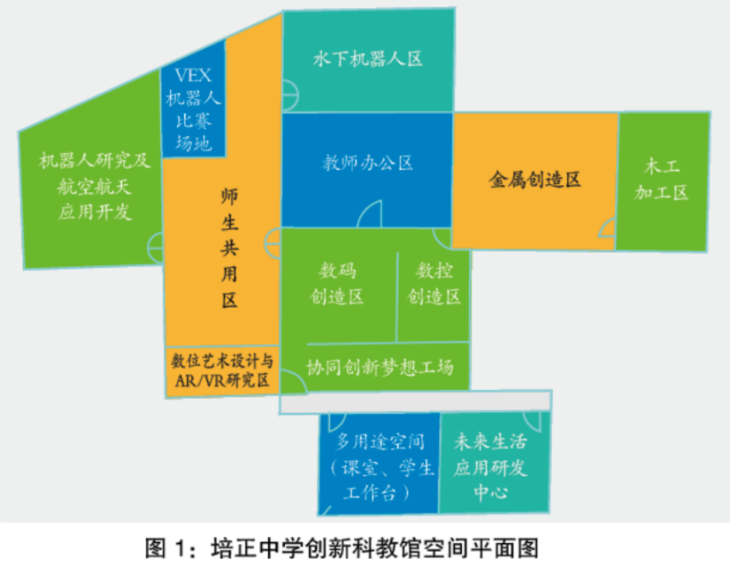 培正中學前身是1889年在廣東廣州創辦的培正學校。現校址位于澳門半島,是一所涵蓋幼兒園至高中的十五年一貫制學校,有3000余名學生。雖然培正中學校園僅7500平方米,工程教育空間“創新科教館”卻占創校120周年紀念大樓中的一層,走進其間即可見充滿活力的工程實踐現場。水下機器人、航空航天應用、數位藝術設計與AR/VR研究區、未來生活應用研發中心等多個工程小組緊湊有序地分布其間(見圖1),真正實現了“聞得到工程氣息,看得見學生創造”。