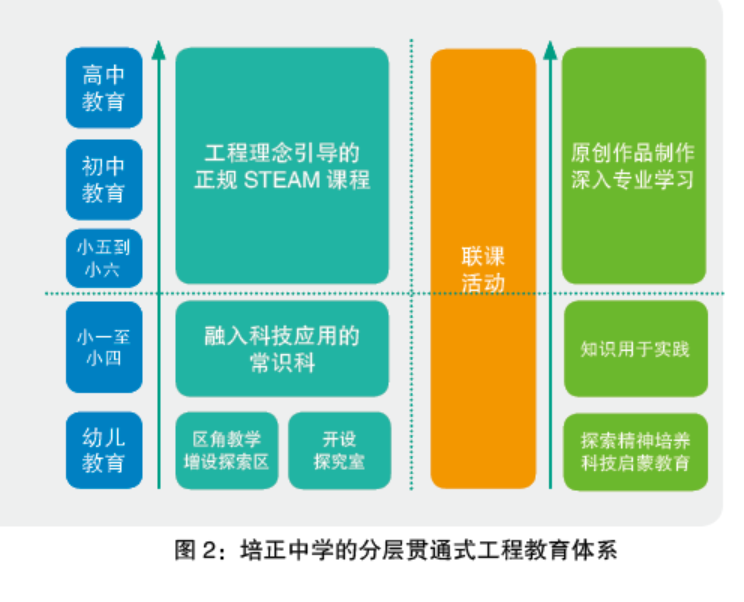 近年來,不少學校重視課程貫通,探索破解由于小升初和初升高帶來的生源不穩定、課程內容設計銜接復雜、學業壓力大等難題。培正中學具備十五年一貫制的體制機制優勢,大多數學生從幼兒園就讀直至高中畢業。對學生而言,無需面對升學考試壓力,也不必頻繁適應不同階段的校園環境;對學校而言,穩定的生源為實現真正意義上的分層貫通式工程教育提供了良好條件。