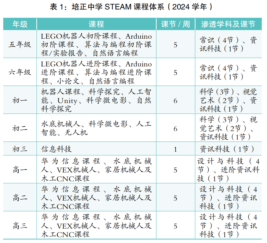 培正中學開發了以機器人為核心(如引入VEX機器人課程)的工程教育課程。教師通過教授機械結構設計、三維建模技術,并整合數學、物理等學科知識,引導學生解決實際問題,培養其跨學科知識應用能力與工程思維。表1展示了培正中學2024學年的STEAM課程體系。課程采用分層教學模式,通過融入并逐步取代傳統課程的方式實施。