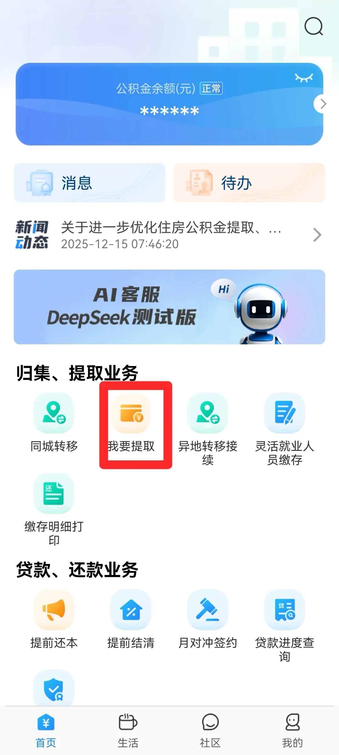 也可以通過手機公積金App進行辦理。首先在手機公積金App首頁的“歸集、提取業務”板塊點擊并進入“我要提取”模塊。