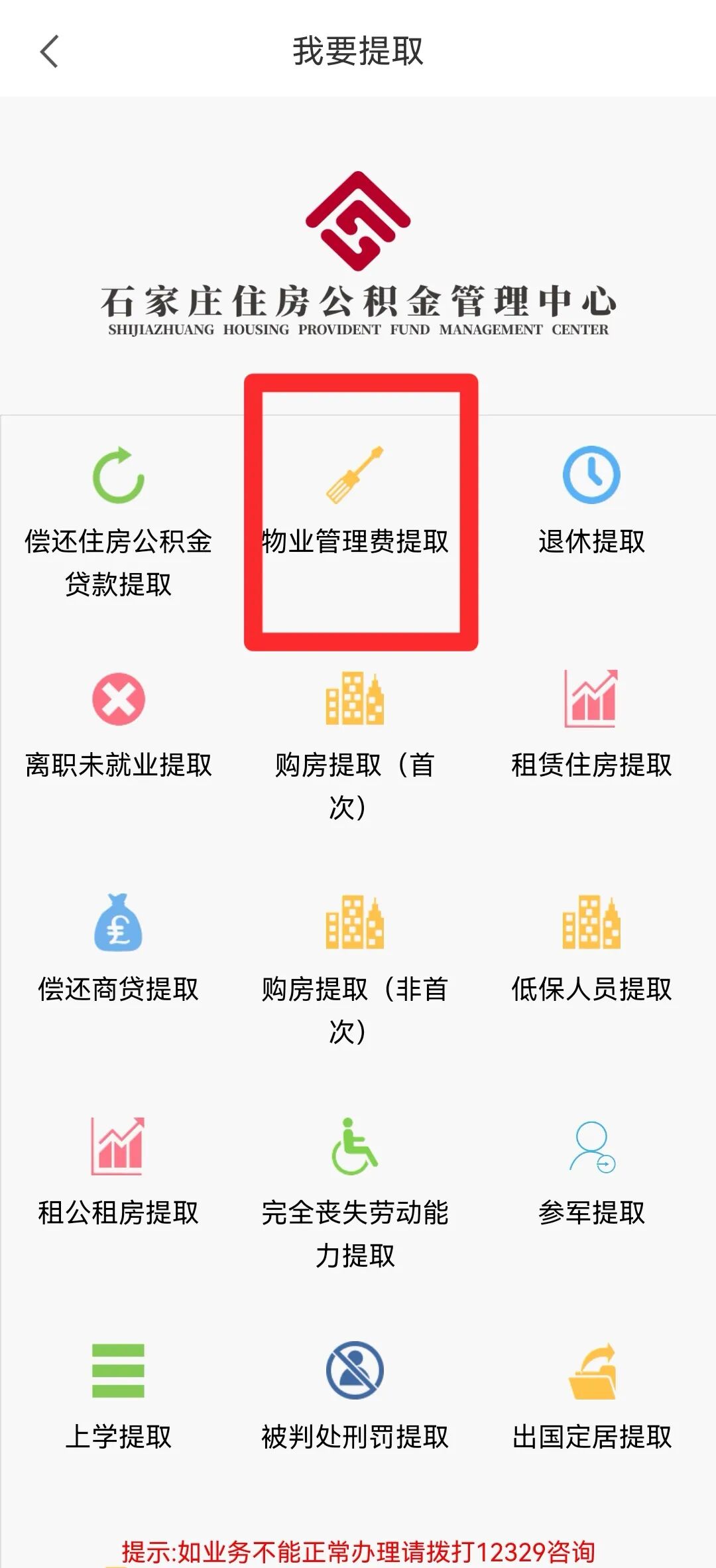 進入“我要提取”模塊后,點擊“物業管理費提取”模塊,按照流程辦理即可。
