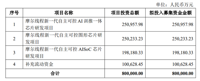 摩爾線程上市時,計劃募資規模是 80 億元,主要投向有三個項目,包括 AI 訓練推理一體芯片,GPU( 消費級顯卡 ),AISoC 芯片( 低功耗專用芯片 )。