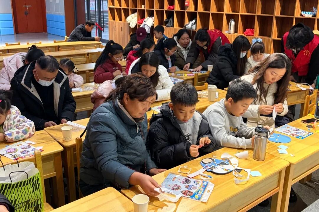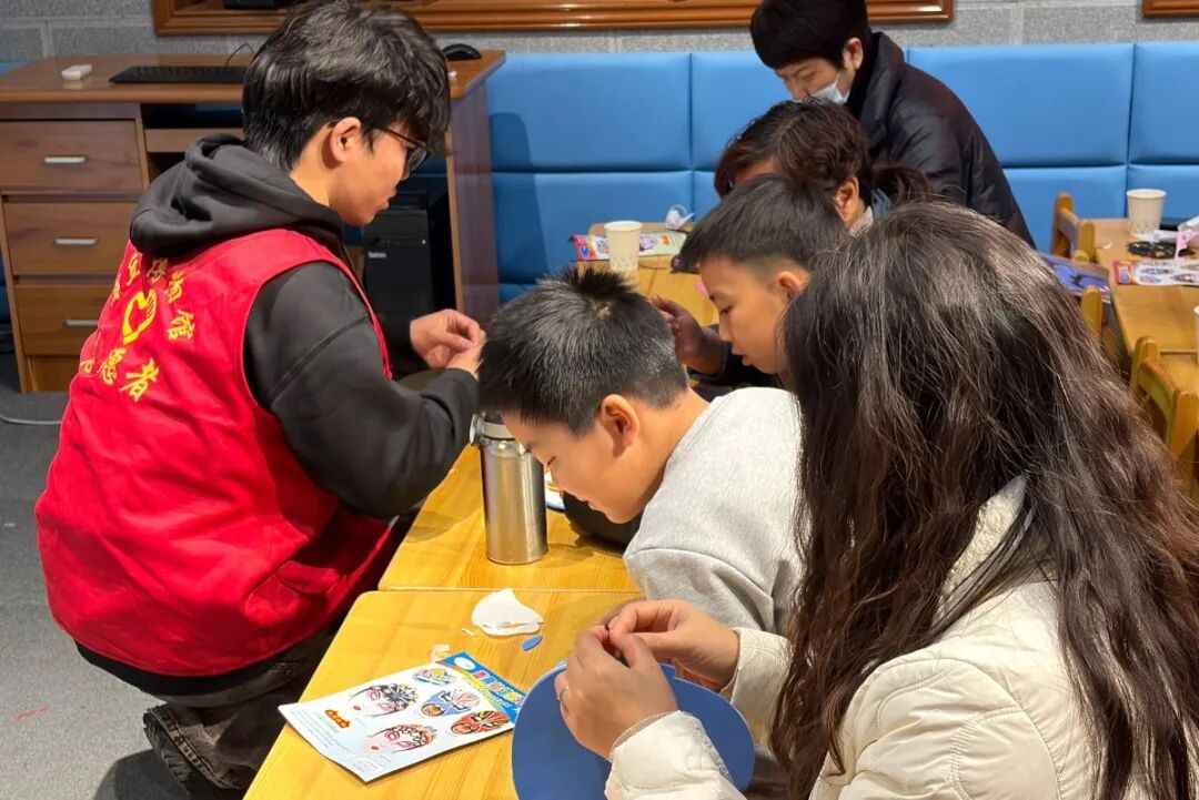 手工創作環節趣味盎然,工作人員為每組家庭送上定制材料包:印有8種男女臉譜樣式的不織布坯、色彩鮮亮的圖案貼片與不干膠。社教老師詳細解讀臉譜的文化內涵——紅臉忠義、黑臉剛直,男性臉譜線條剛毅、女性臉譜紋樣柔美,每種圖案都藏著傳統美學智慧。大家或復刻經典樣式,或創意搭配色彩,家長與孩子分工協作、裁剪粘貼,一張張樸素的不織布在巧手下變身成個性十足的紀念作品,結束后,孩子們紛紛戴上自己親手制作的面具打卡拍照留念,現場滿是贊美與歡笑。
