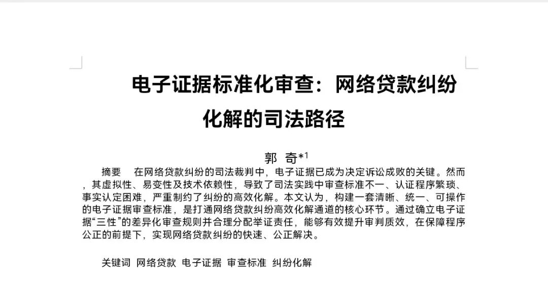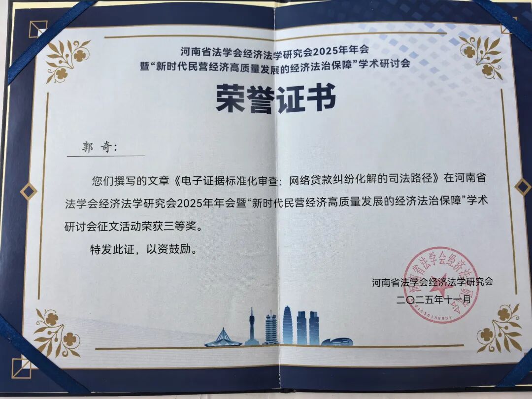 虞城縣人民法院買賣合同團隊法官助理郭奇撰寫的論文《電子證據標準化審查:網絡貸款糾紛化解的司法路徑》榮獲河南省法學會經濟法學研究會2025年年會暨“新時代民營經濟高質量發展的經濟法治保障”學術研討會征文活動三等獎。