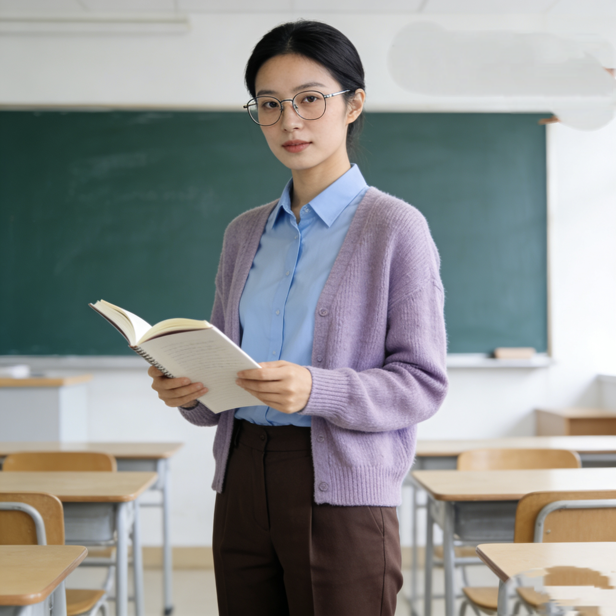 粉筆灰在晨光里輕揚,她站在教室的講臺旁,紫芋色的針織開衫裹著柔和的暖意,藍襯衫的領角透著利落的清爽。手中的課本翻到折角的頁碼,黑板的墨綠作底,她的身影,成了教室里最溫柔的風景,也藏著一段關于教學與成長的溫瀾時光。