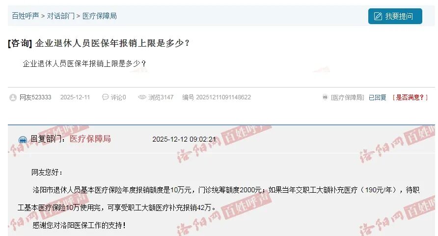 洛陽市退休人員基本醫療保險年度報銷額度是10萬元,門診統籌額度2000元;如果當年交職工大額補充醫療(190元/年),待職工基本醫療保險10萬使用完,可享受職工大額醫療補充報銷42萬。