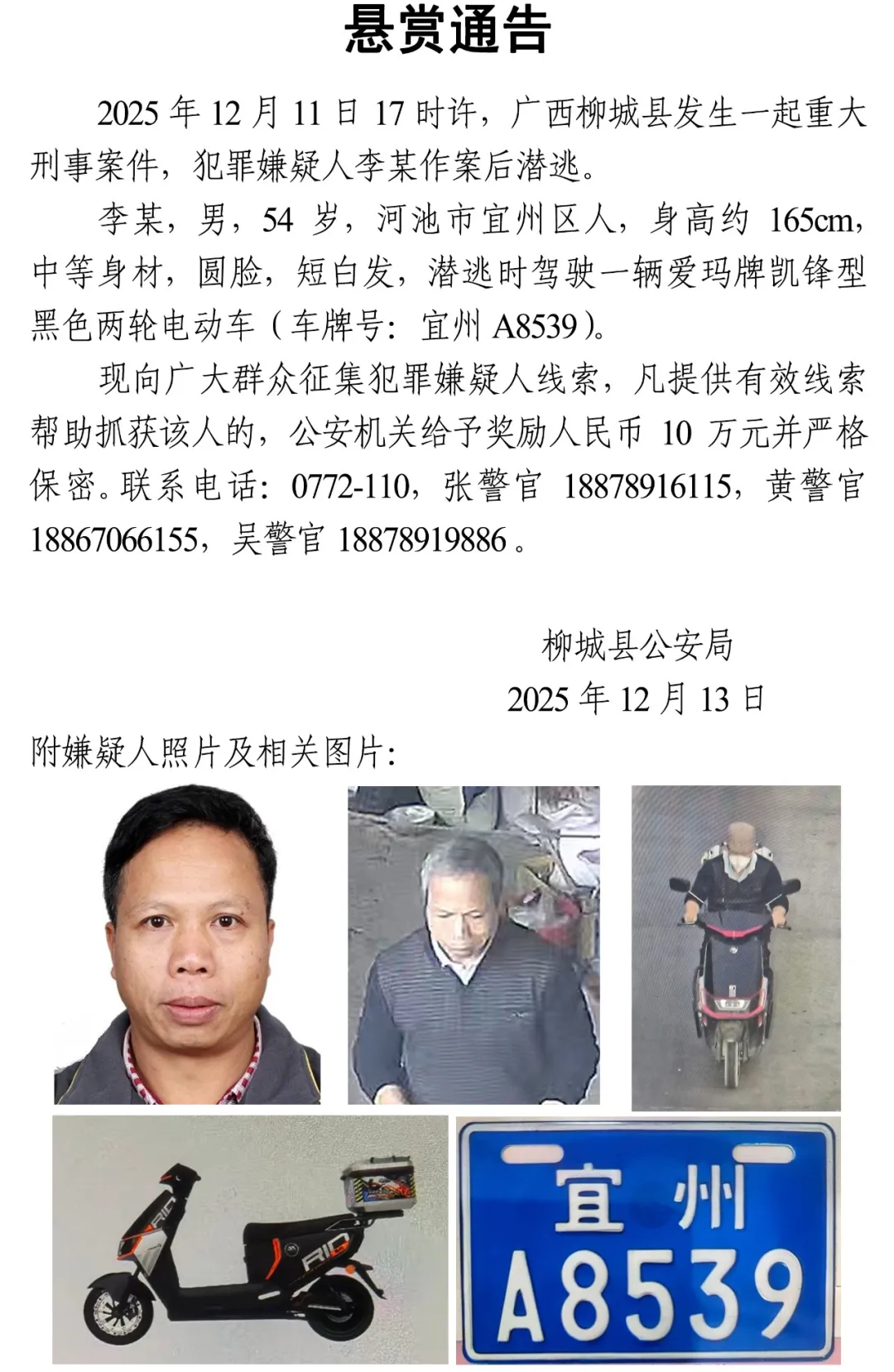 同日,公安局發布懸賞通告:李某,男,54 歲,河池市宜州區人,身高約165cm,中等身材,圓臉,短白發,潛逃時駕駛一輛愛瑪牌凱鋒型黑色兩輪電動車(車牌號:宜州A8539)。