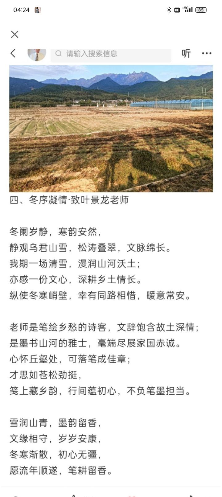 此詩最動人處,在于它讓我們讀懂“雪藏春信”的深意:寒冬的意義,不在凍結萬物,而在讓生命學會蟄伏與積蓄;春信的珍貴,不在驟然降臨,而在它于最冷處悄悄孕育的那份堅韌。烏君山的雪下,藏著的不僅是春天,更是“于寂寂中見生機”的生活智慧——相信吧,再深的雪,也蓋不住萌芽的力量;再冷的冬,也擋不住春天的腳步!