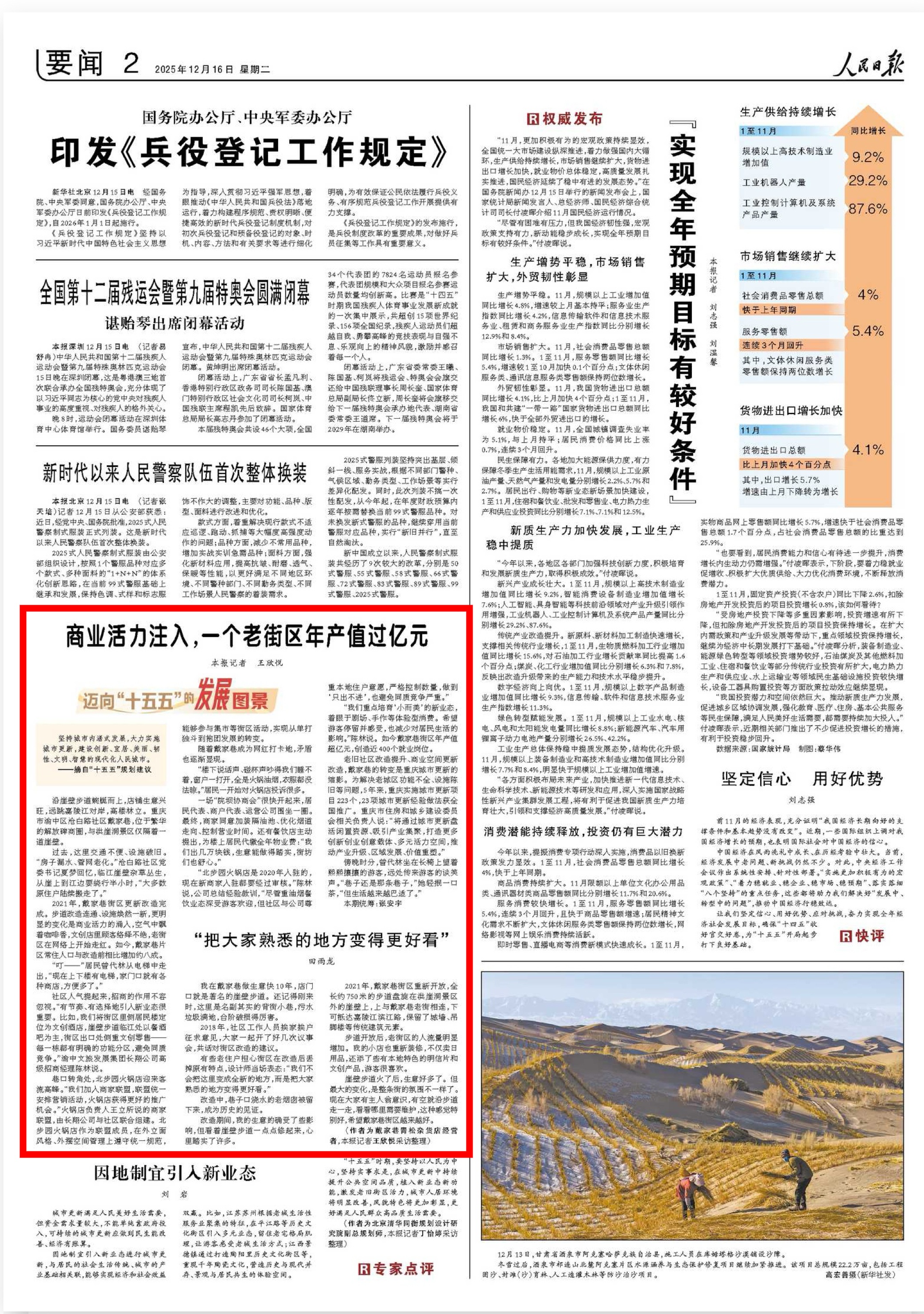 老舊社區改造提升、商業空間更新改造,戴家巷的轉變是重慶城市更新的縮影。為解決老城區功能不全、設施陳舊等問題,5年來,重慶實施城市更新項目223個,23項城市更新經驗做法獲全國推廣。重慶市住房和城鄉建設委員會相關負責人說:“將通過城市更新盤活閑置資源、吸引產業集聚,打造更多創新創業創意載體、多元活力空間,推動產業升級、區域發展、價值重塑。”