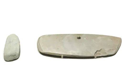 其中,一件以紅褐色花崗巖精心磨制的石矛,以其完備的形制和精湛的工藝,瞬間吸引了所有考古學者的目光。它長12.2厘米,形態規整,矛身呈等腰銳角三角形,直柄方正,弧形的尖鋒兩側刃口薄而鋒利,歷經數千年滄桑,依然透著一股凜然的殺氣。柄頂端清晰的打擊痕跡,仿佛記錄著最后一次被使用的瞬間;而從肩部延伸至矛身中上部的那道弧形淺色帶,則像是時光為它佩戴的榮譽綬帶。