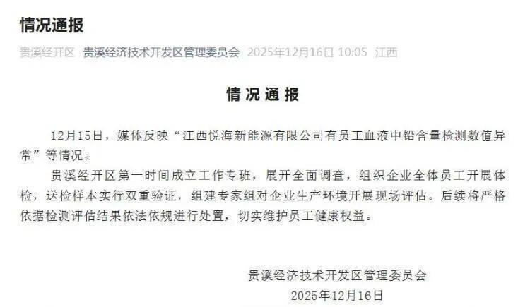 16日,據(jù)貴溪經(jīng)開區(qū)管理委員會通報:貴溪經(jīng)開區(qū)第一時間成立工作專班,展開全面調(diào)查,組織企業(yè)全體員工開展體檢,送檢樣本實行雙重驗證,組建專家組對企業(yè)生產(chǎn)環(huán)境開展現(xiàn)場評估。后續(xù)將嚴(yán)格依據(jù)檢測評估結(jié)果依法依規(guī)進(jìn)行處置,切實維護(hù)員工健康權(quán)益。