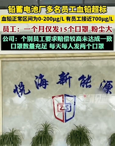 近日,江西悅海新能源有限公司被曝多名員工血鉛含量異常,最高接近700μg/L,遠(yuǎn)超正常參考值(0-200μg/L)。據(jù)報道,涉事企業(yè)主要從事鉛酸蓄電池生產(chǎn),有工人反映車間粉塵大,每月僅發(fā)放15個普通KN95口罩。