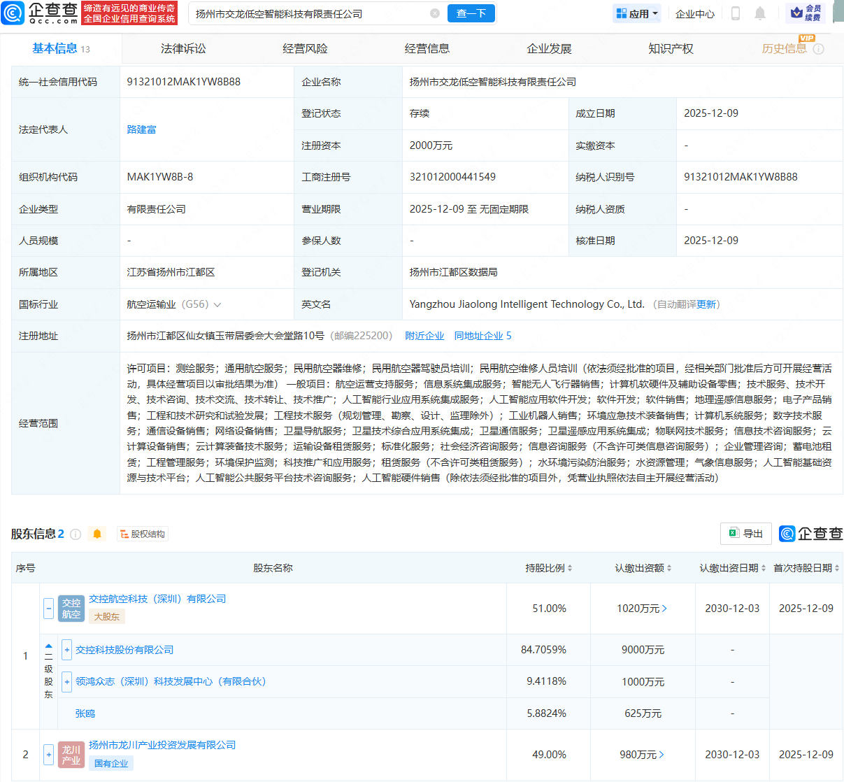 企查查APP顯示,近日,揚州市交龍低空智能科技有限責任公司成立,法定代表人為路建富,注冊資本為2000萬元,經營范圍包含:測繪服務;通用航空服務;民用航空器維修;航空運營支持服務;智能無人飛行器銷售等。企查查股權穿透顯示,該公司由交控科技(688015)旗下交控航空科技(深圳)有限公司、揚州市龍川產業投資發展有限公司共同持股。