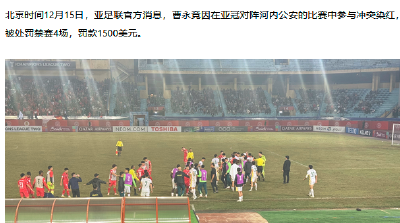 而就在本場比賽結束之后,國安隊內大將曹永競又收到亞足聯重磅罰單。