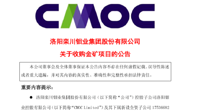 洛陽(yáng)鉬業(yè):擬約10.15億美元收購(gòu)金礦項(xiàng)目