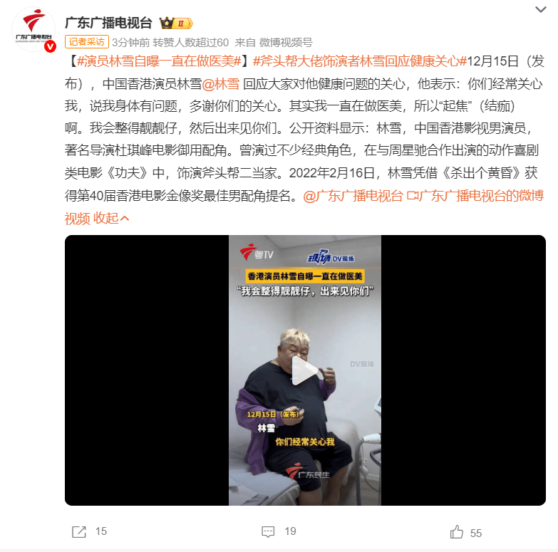 12月15日,演員林雪回應(yīng)大家對(duì)他健康問(wèn)題的關(guān)心,他表示:你們經(jīng)常關(guān)心我,說(shuō)我身體有問(wèn)題,多謝你們的關(guān)心。其實(shí)我一直在做醫(yī)美,所以“起焦”(結(jié)痂)啊。我會(huì)整得靚靚仔,然后出來(lái)見(jiàn)你們。據(jù)悉,林雪是著名導(dǎo)演杜琪峰電影御用配角。在與周星馳合作出演的動(dòng)作喜劇類(lèi)電影《功夫》中,飾演斧頭幫二當(dāng)家。