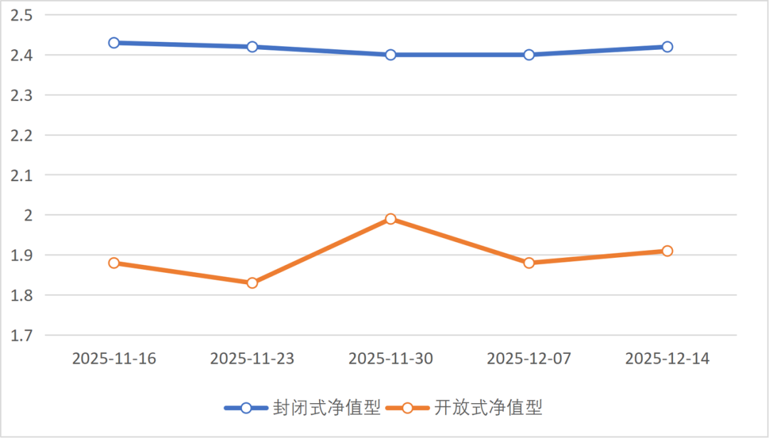 封閉式凈值產(chǎn)品的平均業(yè)績基準(zhǔn)下限為2.14%,高于開放式凈值型產(chǎn)品的1.59%。若以業(yè)績比較基準(zhǔn)平均值作為參考,封閉式凈值型產(chǎn)品(2.37%)略高于開放式凈值型(1.83%)。