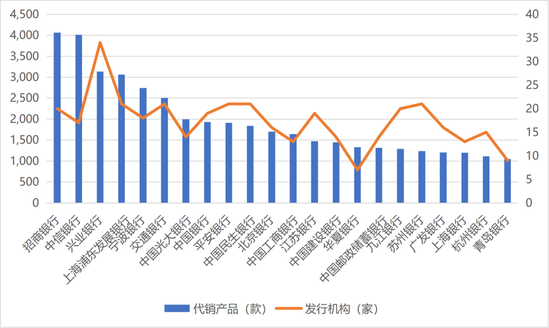 從渠道端來看,目前代銷產(chǎn)品超過1000款的銀行共有22家。代銷產(chǎn)品數(shù)量前三的分別是招商銀行(4061款)、中信銀行(4008款)、興業(yè)銀行(3132款)。興業(yè)渠道對(duì)于理財(cái)產(chǎn)品的接受度最廣,共有34家不同機(jī)構(gòu)的產(chǎn)品在興業(yè)銀行代銷。