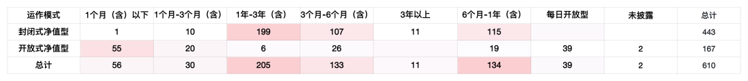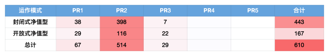 理財(cái)產(chǎn)品運(yùn)作模式及子模式方面,封閉式凈值型產(chǎn)品數(shù)量為443只,開放式凈值型產(chǎn)品數(shù)量167只。開放式凈值型產(chǎn)品中,最低持有期型產(chǎn)品106只,每日開放型產(chǎn)品有39只,固定期限定開型產(chǎn)品11只。