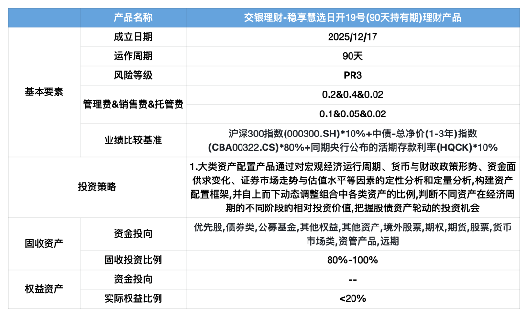 表13 交銀理財(cái)-穩(wěn)享慧選日開19號(hào)(90天持有期)理財(cái)產(chǎn)品基本信息