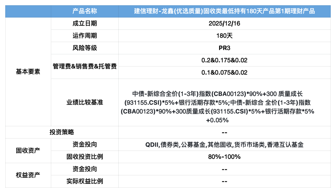 表7 建信理財(cái)-龍鑫(優(yōu)選質(zhì)量)固收類最低持有180天產(chǎn)品第1期理財(cái)產(chǎn)品基本信息