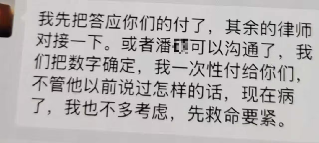 潘某姑姑提供的微信截圖顯示,15日下午5點戴琳轉過來了5000元,然后發消息稱:“我先把答應你們的付了,其余的律師對接一下。或者潘某可以溝通了,我們把數字確定,我一次性付給你們,不管他以前說過怎樣的話,現在病了,我也不多考慮,先救命要緊。”