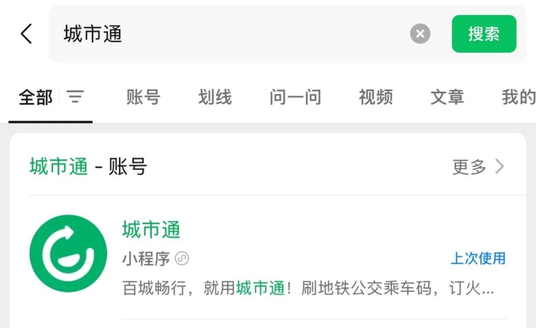 打開微信,在頂部搜索框輸入“城市通”,點進這個小程序。