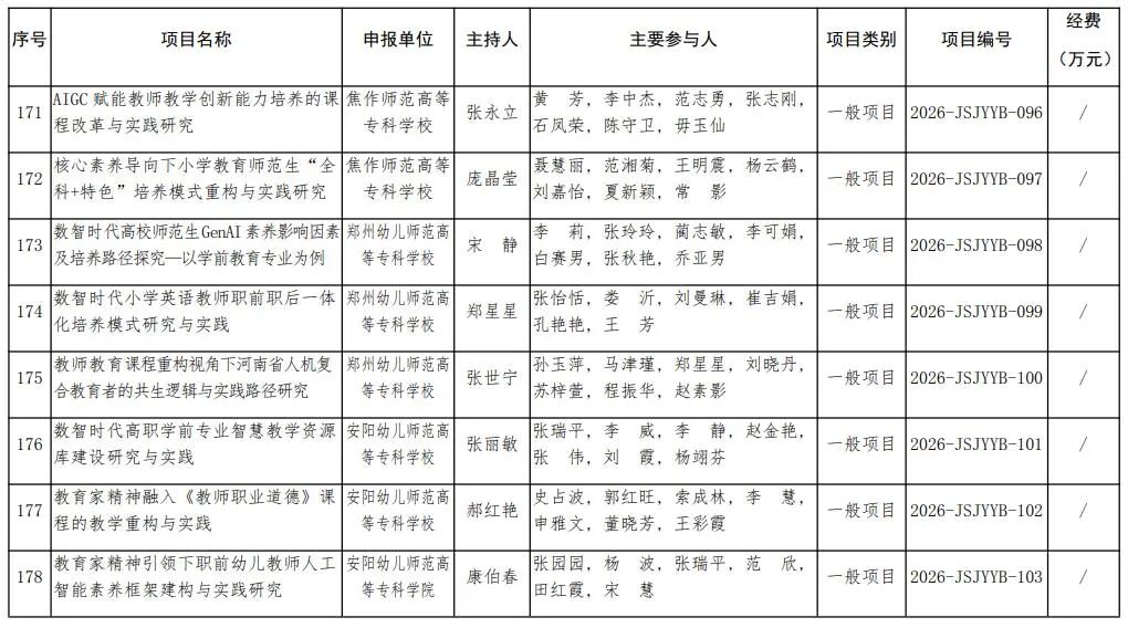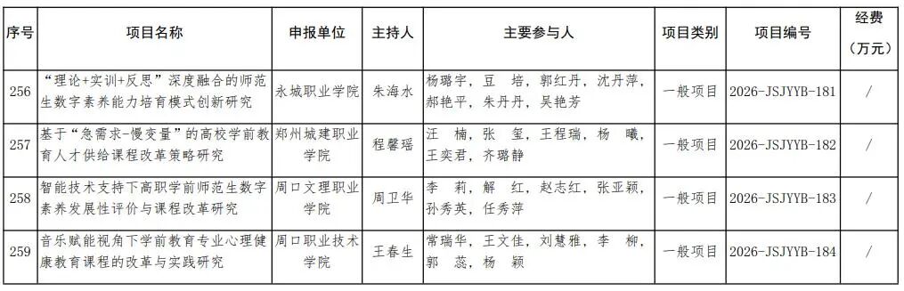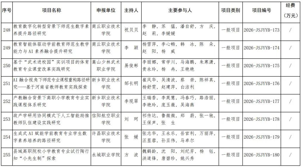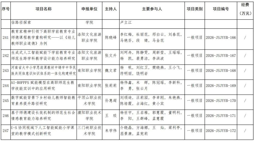 根據河南省教育廳辦公室《關于做好2025年教師教育課程改革研究項目結項和2026年項目申報工作的通知》(教辦師〔2025〕220號)精神,經個人申報、高校推薦、省教育廳組織專家評審、公示等程序,2026年度對河南大學王晉《教育強國戰略下職前教師教育家精神培育路徑創新研究》等259項教師教育課程改革研究項目予以立項建設。現予公布。