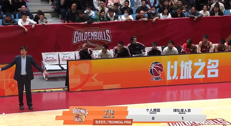 丁偉覺得王少有犯規抗議,裁判給了浙江替補席一個T。