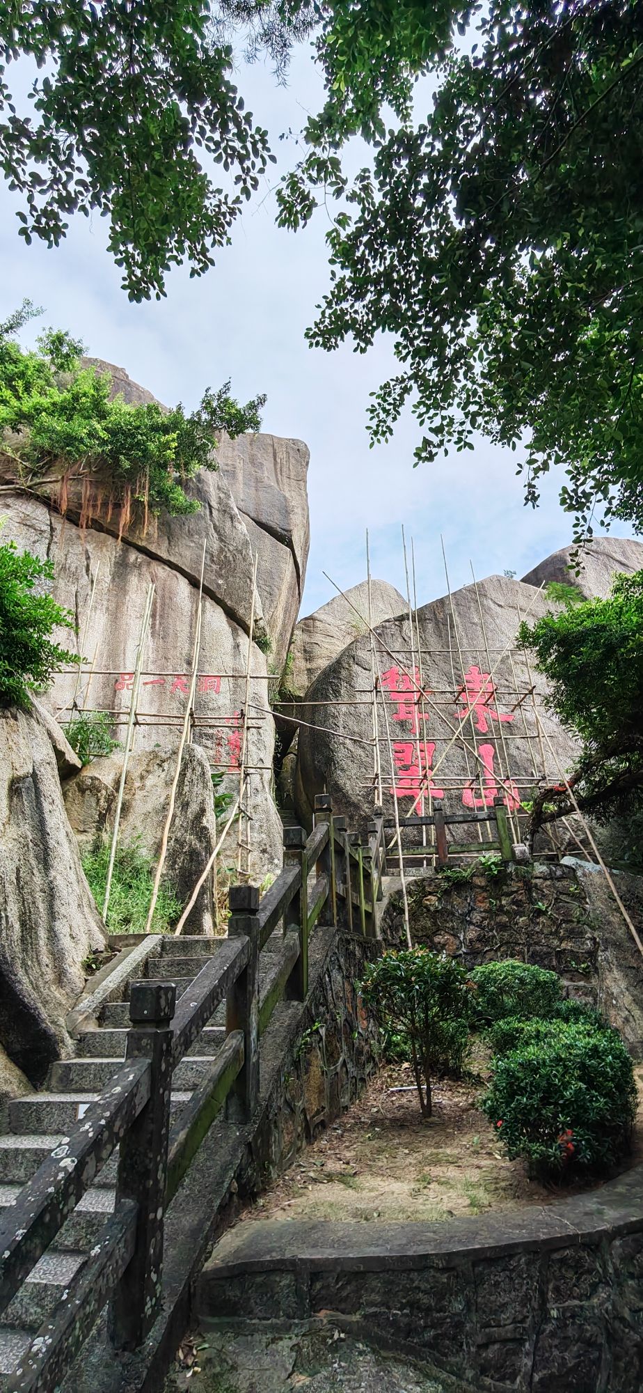 東山嶺的文化底蘊,藏在山間的摩崖石刻里。沿著青石板路拾級而上,兩側的崖壁上,密密麻麻的題刻撲面而來。最負盛名的典故就是東山再起,山涯上的“東山聳翠”四字,筆力遒勁,風骨凜然,相傳是南宋名臣李綱的手跡。靖康之變后,李綱被貶謫海南,途經萬寧時登臨此山,見嶺上松濤陣陣、云霧茫茫,一時觸景生情,揮毫題下這四字。此后,歷代文人墨客慕名而來,或題詩,或刻字,讓這片山崖成了一座露天的書法博物館。那些斑駁的字跡,在風雨侵蝕中褪去了墨色,卻把一段段歷史,嵌進了山石的肌理里。