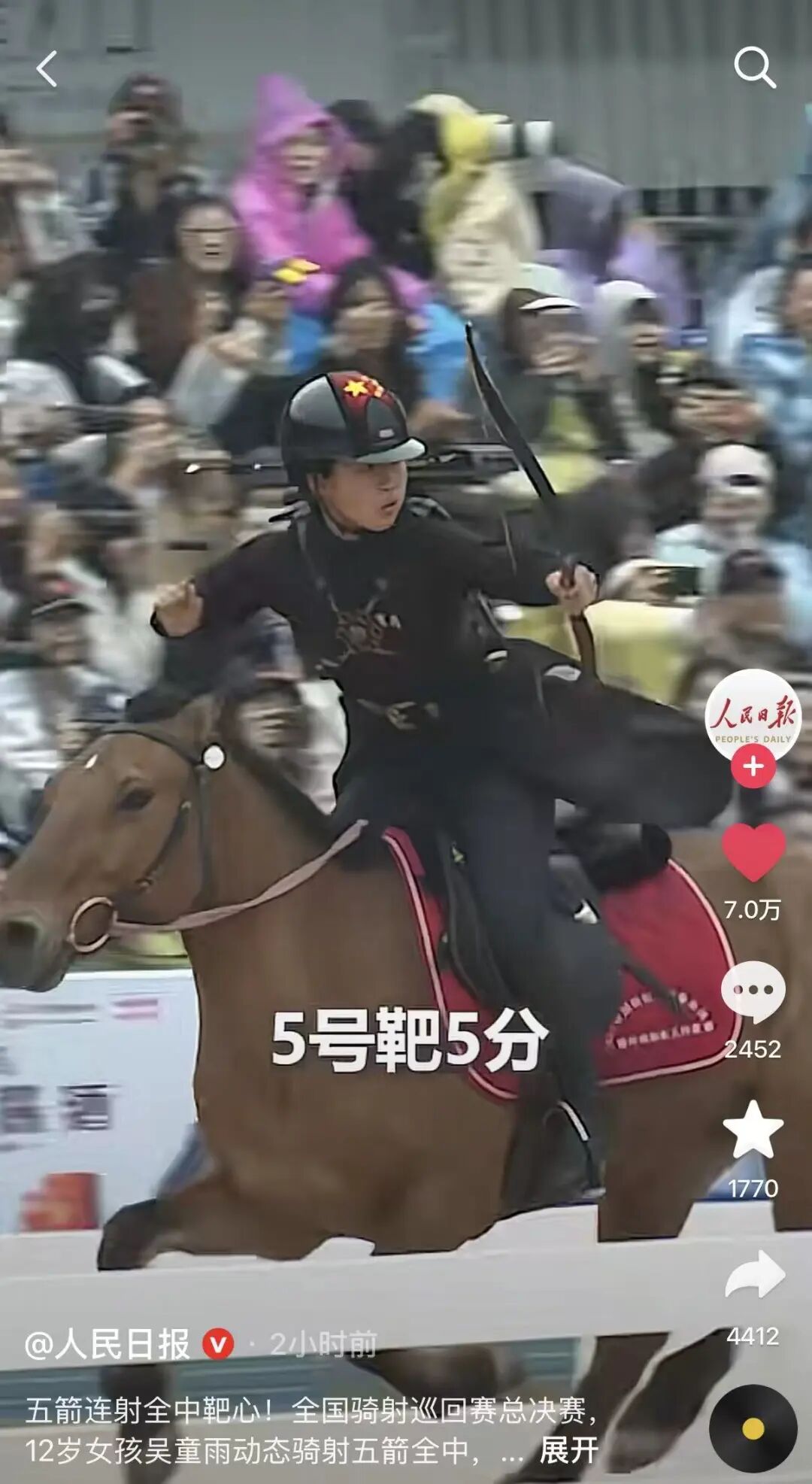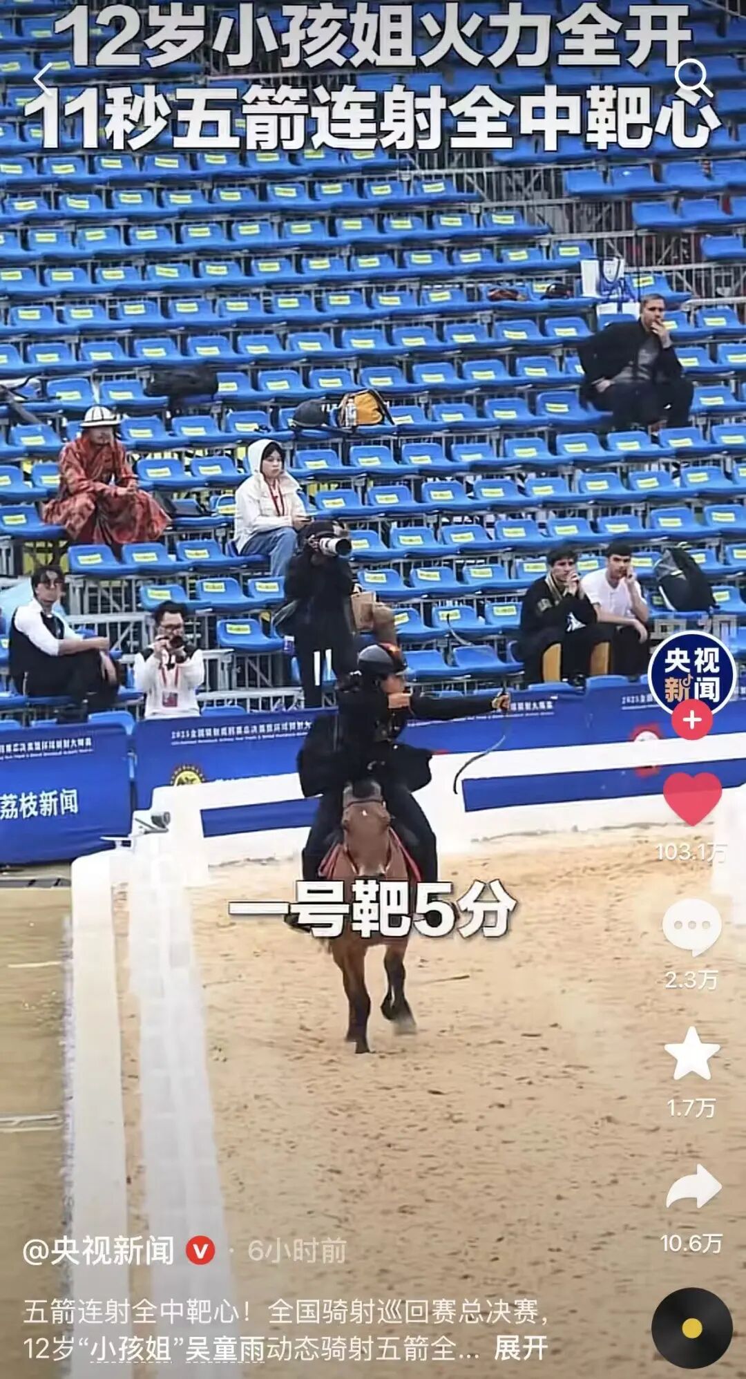 隨后,這位“小孩姐”火速出圈。吳童雨出色的賽事表現迅速被人民日報、新華社、央視新聞等權威媒體爭相報道,掀起刷屏熱潮。央視新聞抖音號相關內容點贊量超103萬、評論2.3萬條;抖音話題?# 11歲少女12秒騎射5連中?登上抖音全國熱搜榜第6,微博話題?# 鮮衣怒馬小孩姐火了?登上同城熱搜榜第3,全網累計點擊量超過1500萬,“小孩姐”引起全網關注。