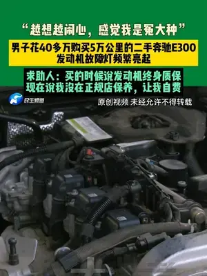 12月16日(發布)河南鄭州,“越想越鬧心,感覺我是冤大種”男子花40多萬購買5萬公里的二手奔馳E300,發動機故障燈頻繁亮起。求助人:買的時候說發動機終身質保,現在說我沒在正規店保養,讓我自費