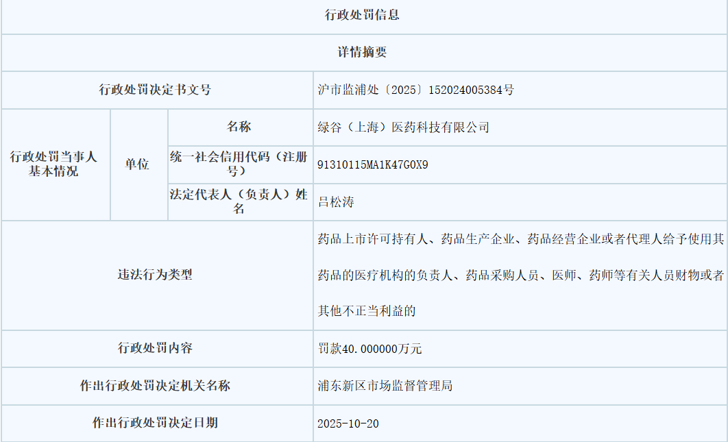據了解,綠谷醫藥已于2025年10月24日繳清這筆罰款。