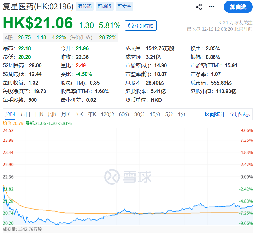 復星醫藥港股一度大跌近10%,但截至收盤,其股價報21.06港元/股,下跌5.81%。