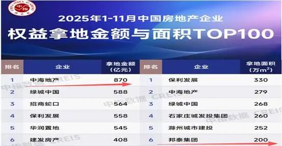 2024年權益拿地額697億,行業第一,超過第二名保利約100億;而今年2025年1~11月權益拿地額870億,依舊行業第一,同時超保利、華潤置地300多億,堪稱“斷層領先”、“一枝獨秀”。