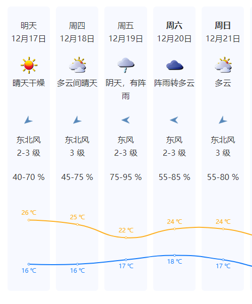 17日,粵北、珠三角和粵西市縣陰天到多云,有分散的零星小雨,其余市縣多云間晴天。最低氣溫:粵北市縣10-13℃,珠江口附近和粵西市縣15-19℃,其余市縣13-15℃。