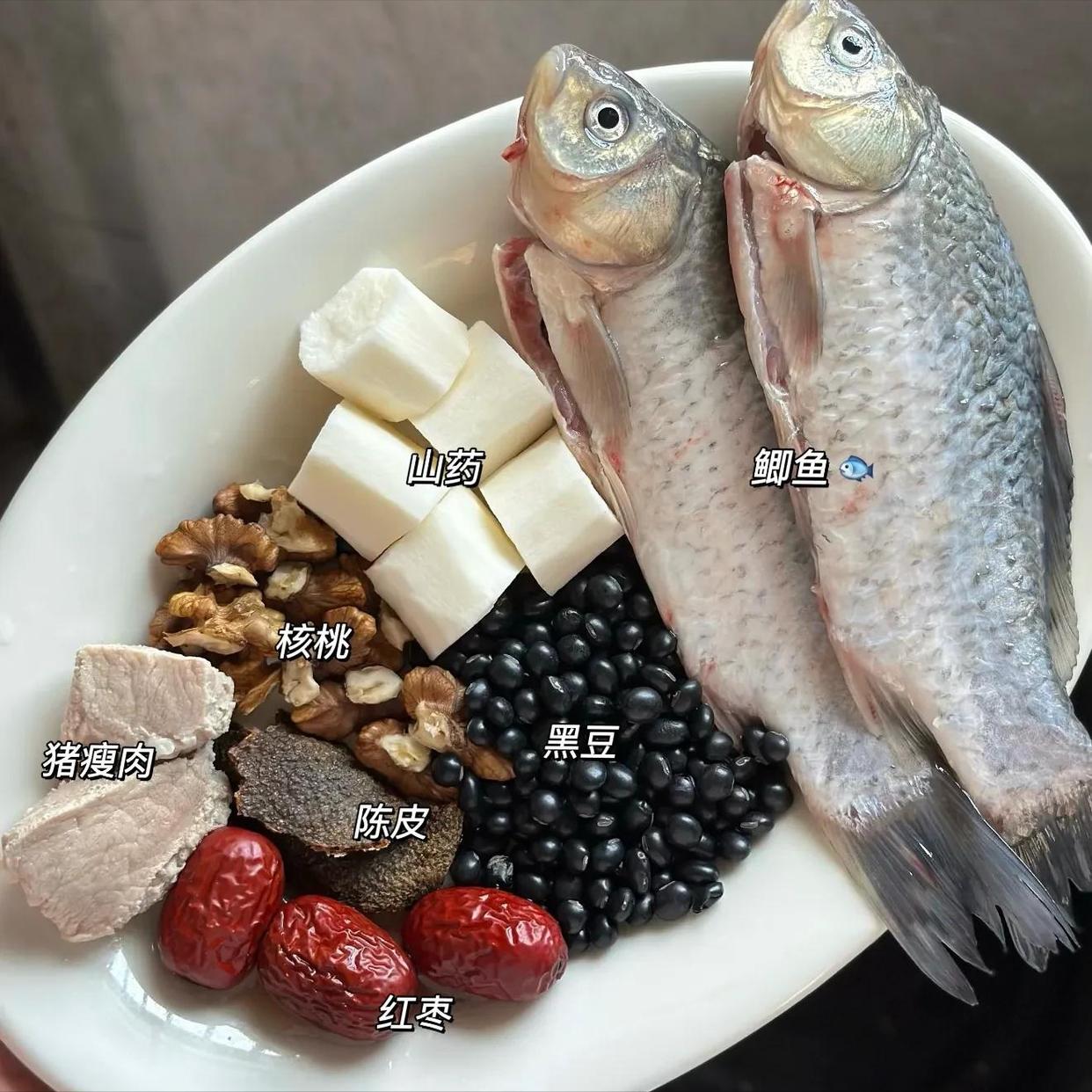 黑豆40克、鯽魚1條、陳皮1片、紅棗2顆、生姜2片、鹽少許、食用油1勺、清水1200毫升