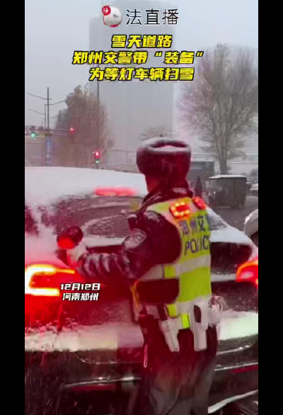 雪天道路鄭州交警帶“裝備”為等燈車輛掃雪