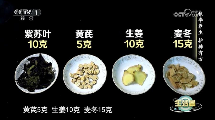 制作方法:黃芪5克、紫蘇葉10克、生姜10克、麥冬15克,洗凈后加入適量清水,浸泡10分鐘后再煮30分鐘,晾至溫熱飲用。