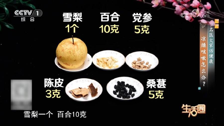 制作方法:將雪梨塊、干百合10克、黨參5克、陳皮3克、干桑葚5克一同放入鍋中,加入適量清水,煮40分鐘即可。