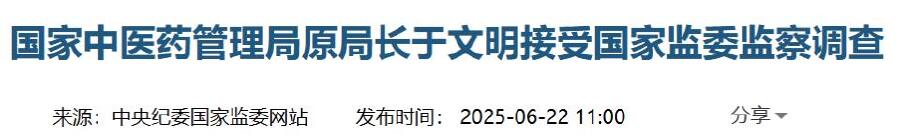 2025年6月,中央紀委國家監委網站曾發文《國家中醫藥管理局原局長于文明接受國家監委監察調查》。內容顯示,國家中醫藥管理局原局長于文明涉嫌嚴重職務違法,目前正接受國家監委監察調查。