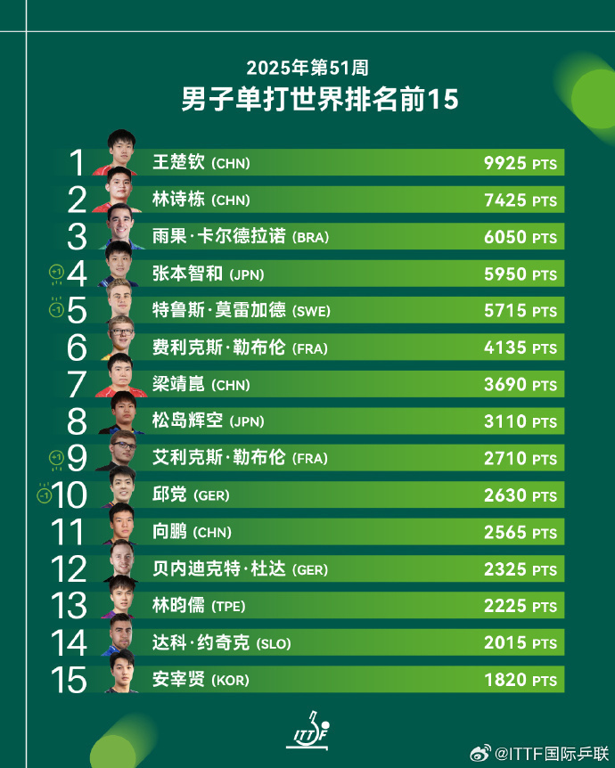 北京時間12月17日消息,國際乒聯2025年第51周世界排名火熱出爐。男子單打方面,3名中國選手位居前十,其中“大頭”王楚欽、“小石頭”林詩棟高居前兩位。從排名積分來看,王楚欽并未受到WTT受傷無緣冠軍的任何影響,以9925分力壓張本智和的5950分。