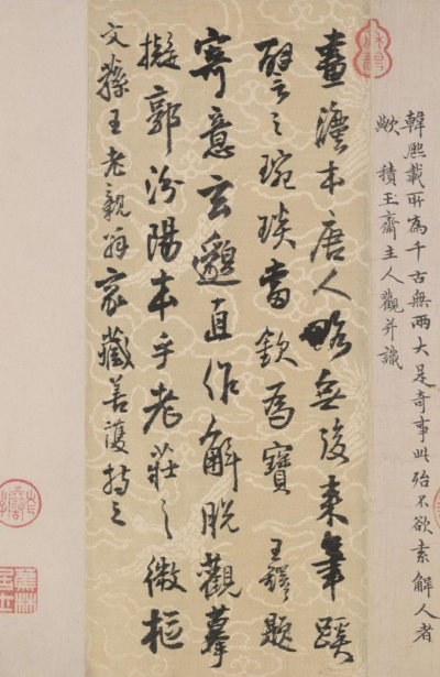 王鐸《瑯華館貼》 - 這段題跋道出了張鼎延刊刻《瑯華館帖》的始末,從帖中的諸多信札內(nèi)容去研究,也大可窺見王鐸在入清前后不同時期的心境。在同年的二月十八日,王鐸為張鼎延臨寫了著名的《淳化閣帖》,他在款識中說:“辛卯二月十八日,玉調(diào)親家攜卷求書,予書何足重,但從事此道四十年,皆本古人,不敢妄為,故書古帖。瞻之在前,瞠乎自惕。譬如登霍華,自覺力有不逮,假年苦學(xué),或有進步耳。他日當為親家再書,以驗所造如何。”可見“皆本古人,不敢妄為”八字的學(xué)書理念,一直貫穿了王鐸的一生。但有意思的是他的朋友王弘,在這一年看了大量王鐸的書法新作,卻是不以為然,說他:“宗伯于書道天分既優(yōu),用工又博,合者直可抗跡顏柳,晚年為人略無行簡,書亦漸入惡趣。奉命來祭華岳,為賊所困,留滯華下,寫字頗多。蓋縱橫馳失晉人古雅遺則,乃至?xí)放c人品相為表里,不可掩也。”大概王弘首先是對王鐸晚年品行的批評而及書作,才有此一論,至于王鐸晚年書法是否不佳,當別作一談。