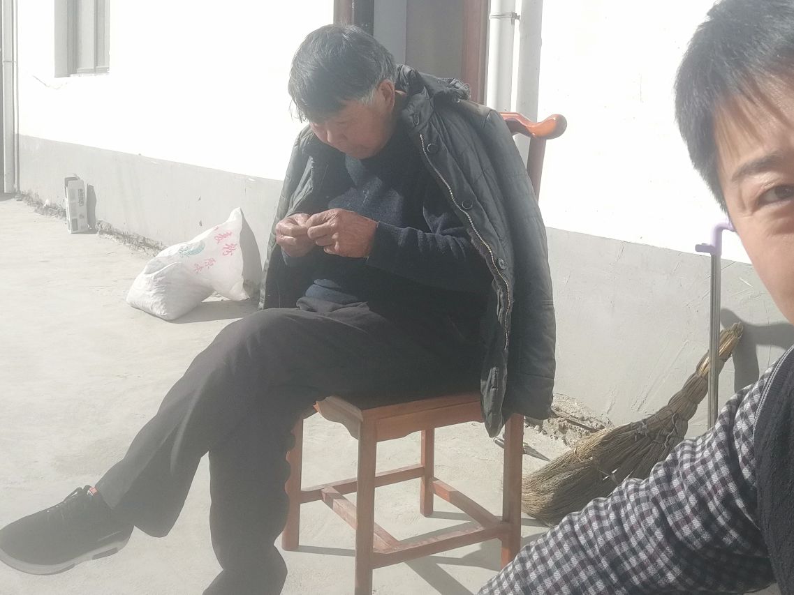 最后一次,見到老人是2月份。因為要辦什么事,到村里酒廠去。當天太陽很好,事辦完后,在酒廠的小院子里坐一會兒,給逢軍老人打個電話。電話響了好幾下才接通。老人很快就過來了。看到我后很高興。他說我在和老伙計“閑拍”,一看你電話知道你肯定來了。老人臉色黝黑,眼睛笑的時候瞇成一條縫。他可能平時笑的多,所以臉上的皺紋是那種經常笑留下來的那種走向。單從他臉上的樂觀的皺紋,你會覺得這一定是個幸福樂觀的老人。如果不深入了解,你很難想到,面前這個整天笑呵呵的老人,一生其實經歷了許多常人難以承受的苦難。我們倆一人一個板凳,坐在太陽光里,就那樣瞎聊。聊些什么,現在都忘了。中間,我掏出手機,給我們自拍了兩張照片。當時太陽有點熱,曬的睜不開眼,他低著頭,不知道我照像。否則,我倆應該好好照一張。這是我倆最后一次見面。
