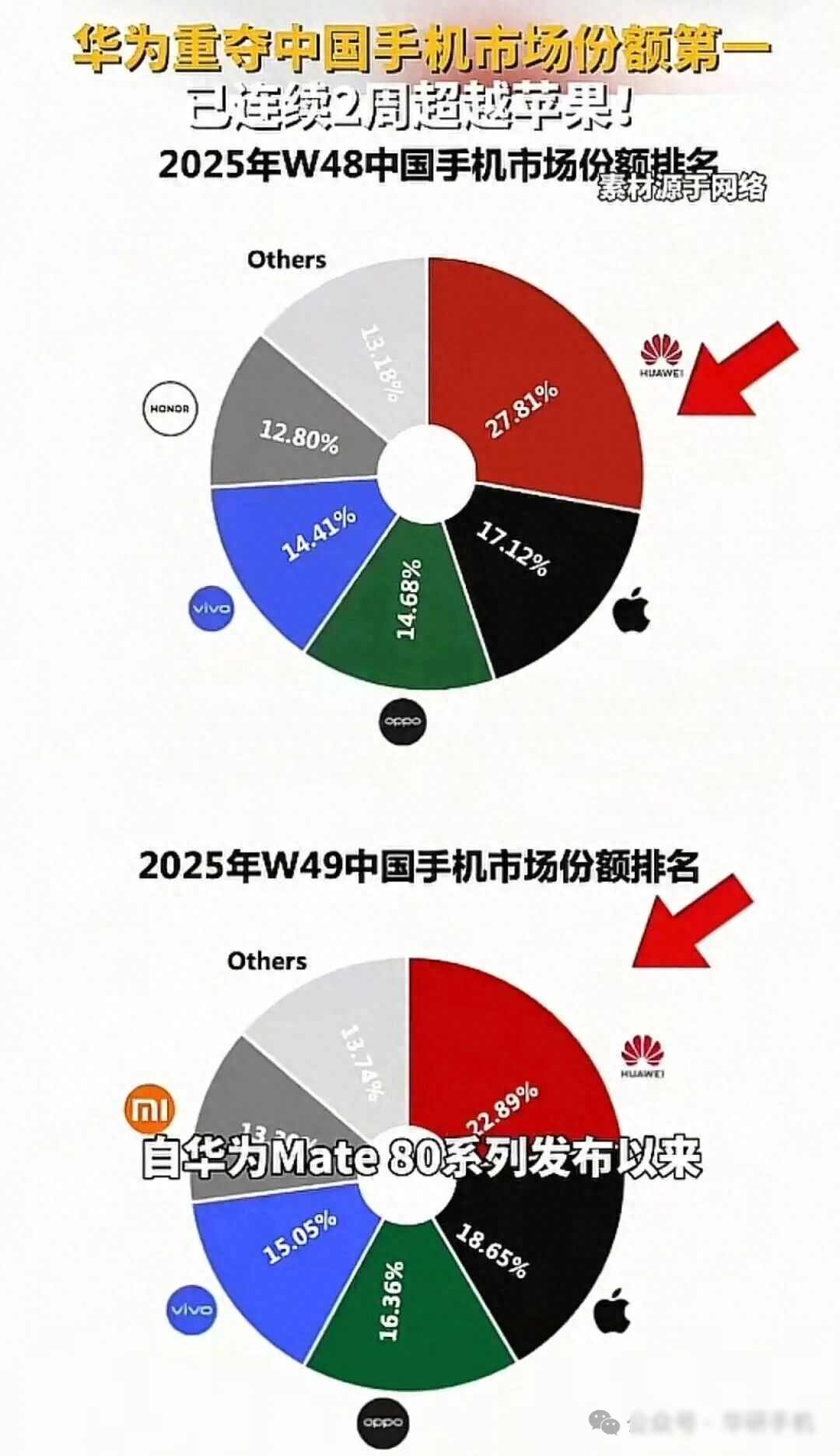 這件事說起來很有意思,華為在2025年11月底的時候推出了Mate 80系列和折疊屏X7,沒過幾天市場份額就超過了蘋果,到11月最后一周,華為占了27.8%,蘋果只有17%多一點,到了12月初華為還是排第一,蘋果那邊掉到了18%,這不是碰巧發生的,是靠實實在在的銷量撐起來的。
